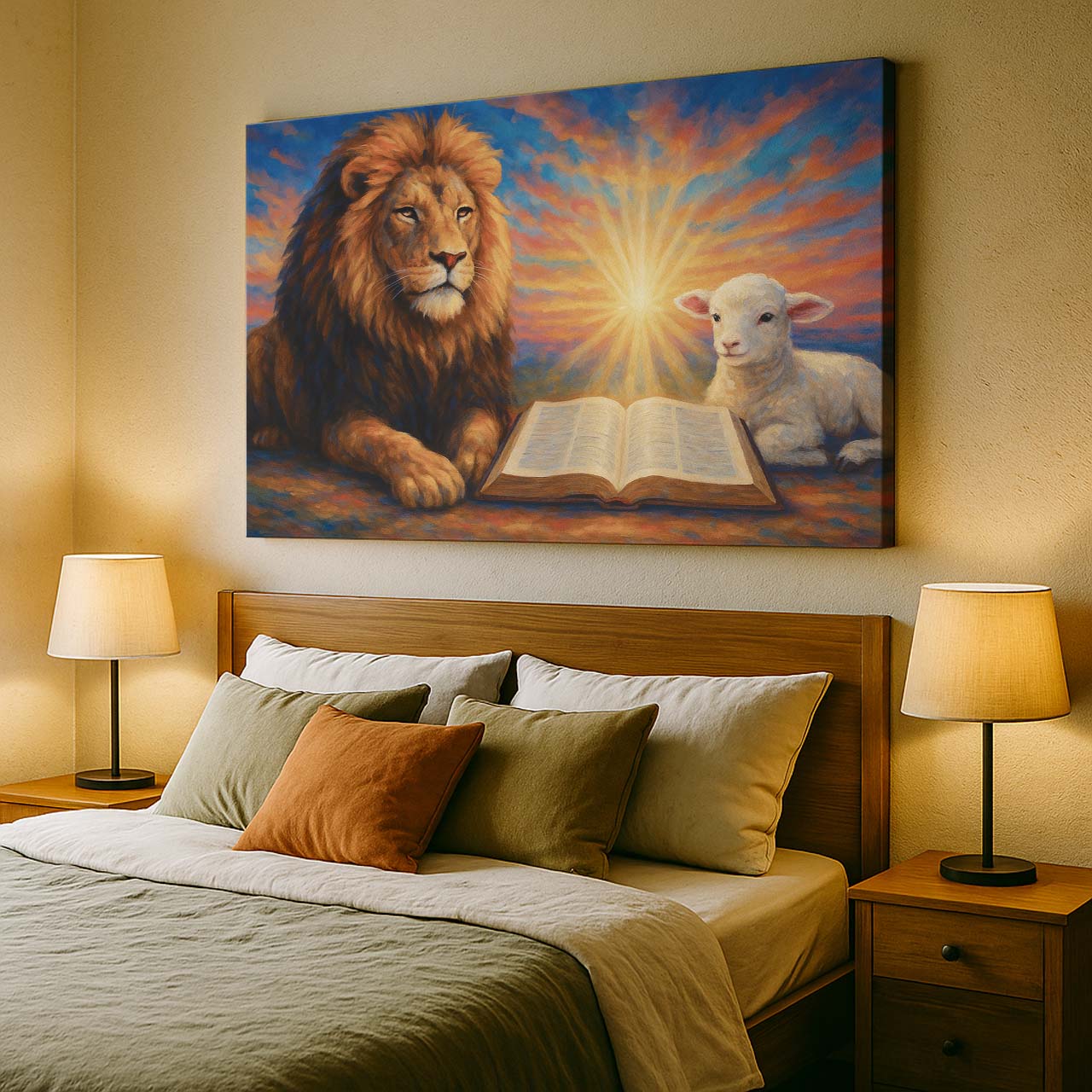 This Christian wall art canvas features a majestic lion resting peacefully beside a gentle lamb in front of an open Bible, all illuminated by a radiant sunrise. The artist’s rich brushstrokes capture the soft textures of the lamb’s fleece and the lion’s mane, inviting quiet contemplation.