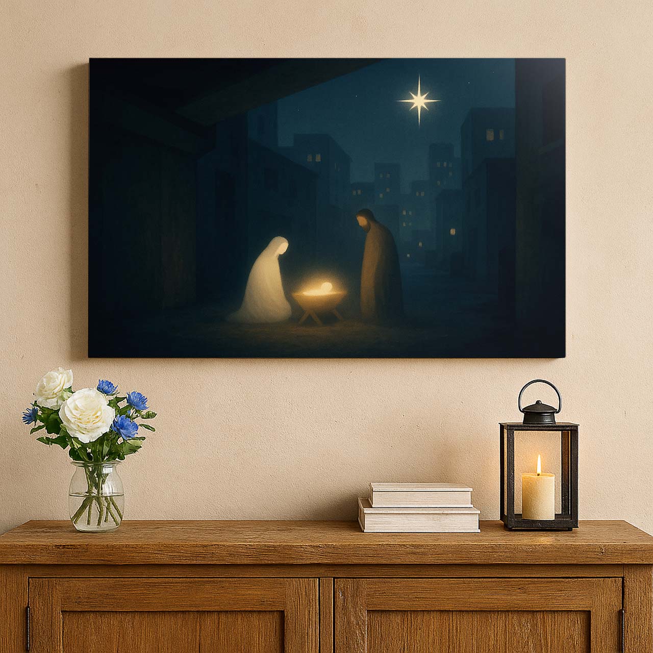 Hang this serene piece in living rooms, nurseries, entryways, or church spaces to reflect on the miracle of Christ’s birth. Its contemporary design adapts effortlessly to various décor styles, inviting moments of calm reflection.